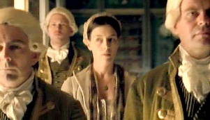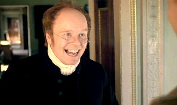In the film, Jane is shown as feeling some apprehension and awkwardness as she walks through the grand house accompanied by footmen in livery to meet Rev. James Stanier Clarke (left in movie). Although no record
