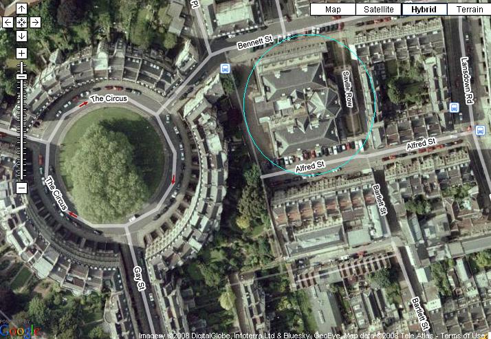 Assembly Room near the Circus; You can see the dome of the Octagon Room from the air, near Bennet Street and Saville Row.