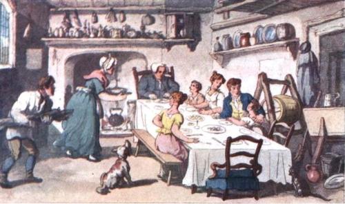Notice in this image of a family sharing a meal by Thomas Rowlandson (from The Vicar of Wakefield by Oliver Goldsmith), that the meal is eaten during the day and near the fire.