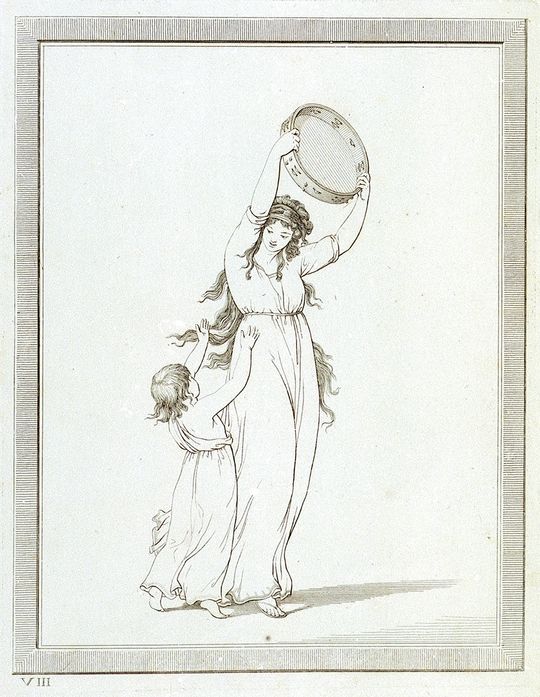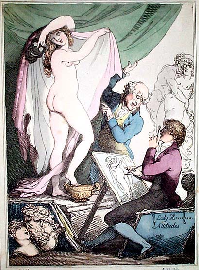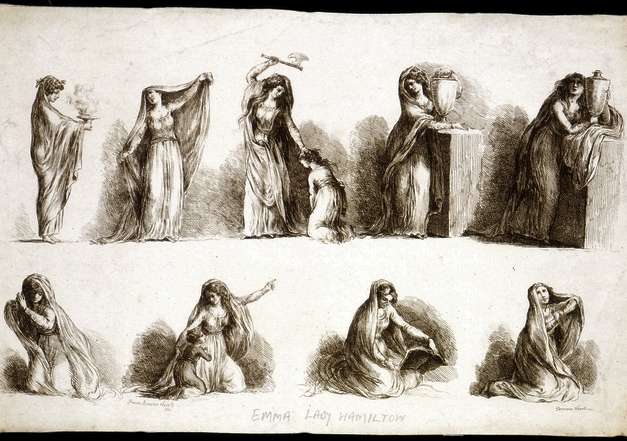 Emma’s stint as Romney’s model had given her experience posing in various classical guises. She’d also had the dubious distinction earlier in her career in London, of having worked as a scantily clad model and dancer – or “Goddess of Health” – at Dr. Graham’s Temple of Health and Hymen, which claimed to cure the reproductive and sexual problems of couples. Emma used her “theatrical” experiences to develop her “Attitudes”. In helping Emma design her act, Sir William, whose knowledge of the imagery on classical vases was authoritative, used ancient Roman pantomimes as a model. The result of their collaboration was a silent performance that combined poses, classical dance and acting with Emma’s special allure. Emma gave her first showing in spring of 1787 to a group of European guests. Sir William held the lights and introduced his wife, as he would do for all her theatrics.