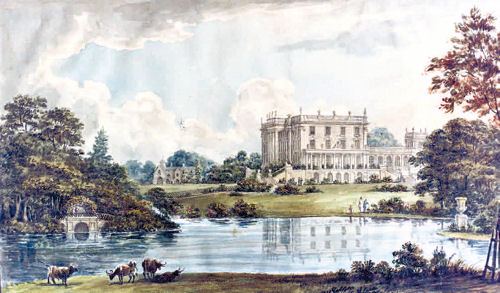 “Now I wish to give you some idea of the inside of this vast house – first premising that there are forty-five windows in front, which is quite straight, with a flat roof, fifteen in a row. You go up a considerable flight of steps to the door, for some of the offices are underground, and enter a large hall. On the right hand is the dining-room and within that the breakfast-room, where we generally sit; and reason good, ’tis the only room besides the chapel, which looks towards the view. On the left hand of the hall is the best drawing-room and within a smaller one. These rooms are rather gloomy with brown wainscot and dark crimson furniture, so we never use them except to walk through to the old picture gallery. Behind the smaller drawing-room is the state-bedchamber – an alarming apartment, with its high, dark crimson velvet bed, just fit for an heroine. The old gallery opens into it. Behind the hall and parlours there is a passage all across the house, three staircases and two small sitting-rooms. There are twenty-six bedchambers in the new part of the house and a great many, some very good ones, in the old.