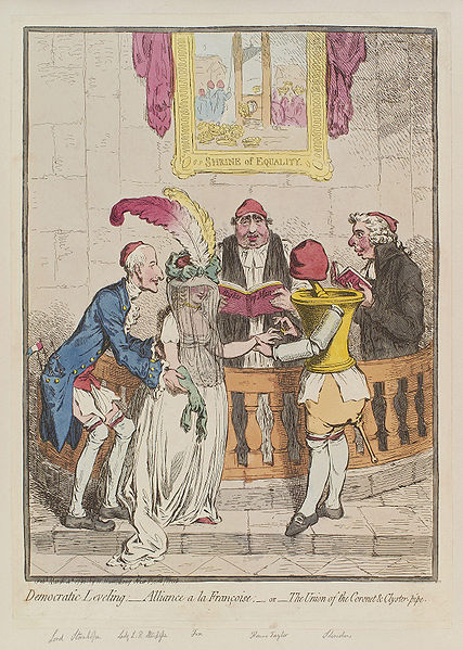 As an interesting aside, one of the 3rd Earl of Stanhope’s third daughter’s eloped with the family apothecary, prompting James Gillray to draw the cartoon, Democratic Levelling: Alliance a la Francaise, The Union of the Coronet and Clyster Pipe. (A coronet is a small crown symbolizing a peer’s status and a clyster pipe was a tube used for injections). The earl was a great proponent of liberty and revolution, but this marriage sorely tested his tolerance for equality! One wonders what Mr. Bennet might have said had Jane or Lizzie run off with Mr. Jones!