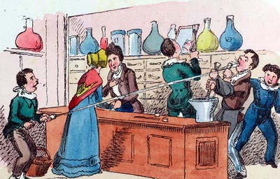 Doctor: What! an apothecary tell a physician he mistakes! You pretend to dispute my prescription! Pharmacopola componant. Medicus folus prefabricat. Fumigate him, I say, this very evening, while he is relieved by an interval’