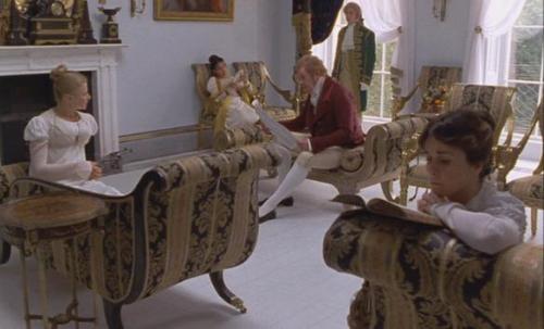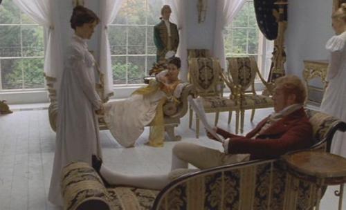 From these images it is quite obvious that the set designer of this film chose furniture and draperies that for the Regency era would have been regarded as ultra fashionable. Sir Walter might have moved from Kellynch Hall to reduce his expenses, but his tastes remain expensive and he shows no inclination to follow the rules of economy.