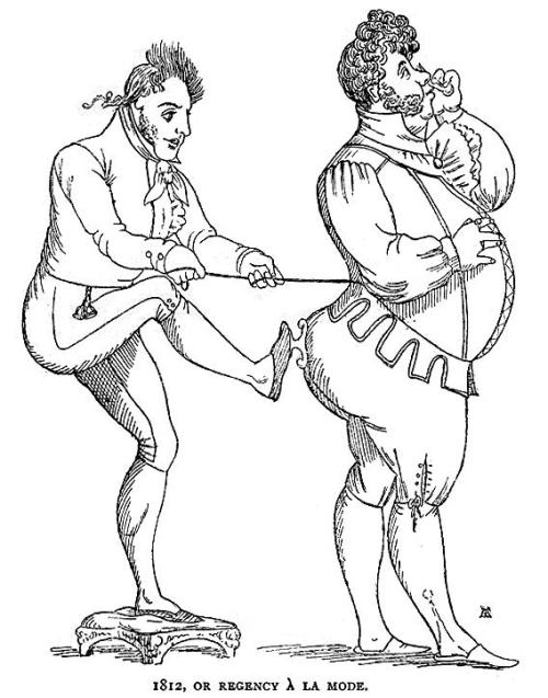 There can be no doubt, indeed, that just as the large cravat resulted from defects in the royal neck, so the stays in later years became necessary to restrain the unwieldy proportions of the royal waist, and assumed by the dandies as an act of compliment to their patron. The caricatures of the day exhibit an Illustrious Personage lifted up and struggling to insert his legs into a pair of “leather”s of a size he was anxious to appear in – which are securely lashed to the bed posts to give a sort of purchase in furtherance of his efforts – just as in 1784 stories were told of Monseigneur d’Artois, the brother of Louis XVI of France, needing the aid of four tall lacqueys to put on and off, without creasing, his small clothes of a special make and kind. – Once a Week, Volume 10