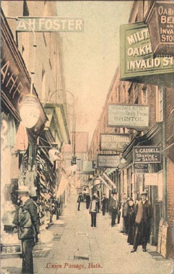 Cheap Street runs just north and parallel to the Abbey. In this turn-of-the-century post card of Union Passage, which intersects Cheap Street, one can see how drastically different Bath looked back then – many of the Georgian features are hidden under shop signs.