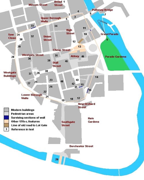 The Walking Tour of Bath provides a map that mentions many of the streets described by Jane Austen in the above passage, accompanied by images from medieval times to today.