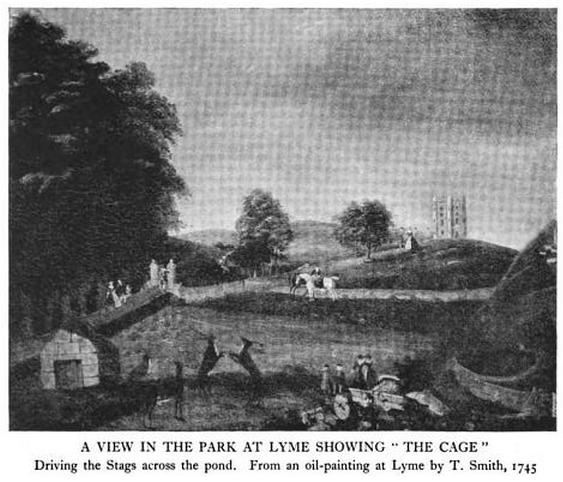 The custom however appears not to have been peculiar to Lyme, as Dr Whitaker describes, in his Account of Townley, ( the seat of a collateral line of Legh,) near the summit of the park, and where it declines to the south, the remains of a large pool, through which tradition reports that the deer were driven by their keepers in the manner still practised in the park at Lyme.” – The Mirror of Literature, Amusement, and Instruction, Vol 14, Percy and Timbs, 1829, p 101-102