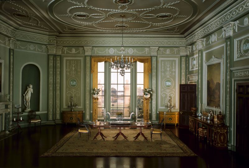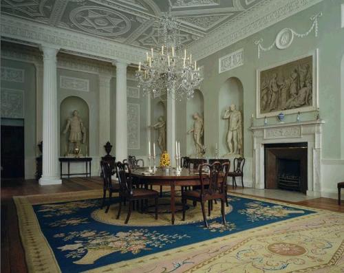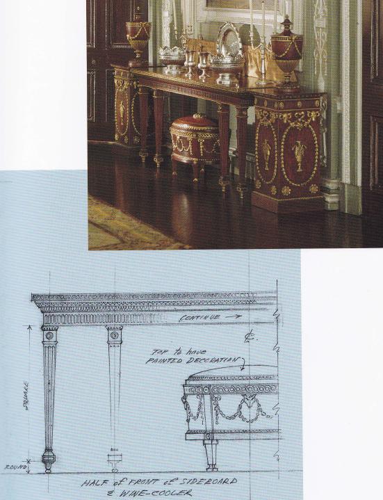 Like Adam, who had control over all aspects of the design, including the architecture, decoration, antiques, furniture,wall papers, paint and plasterwork, Mrs. Thorne closely oversaw each detail of her exquisite rooms. The furniture throughout Mrs. Thorne’s version of the Adam dining room were decorated with ram’s heads, as was the frieze. The urns on the fireplace mantle are copies of Wedgwood examples, and the paintings over the mantle and side table are after Claude Lorrain.