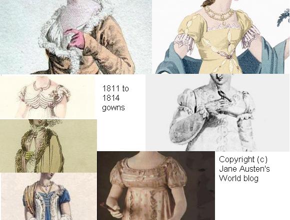The high necklines of the 1815 morning gown at top left and Mrs. Jens Wolff’s 1815 satin dress at top right would make a Quaker lady proud. The two 1816 evening gowns show a relatively modest neckline (lower left) and one that could be quite daring (lower right).