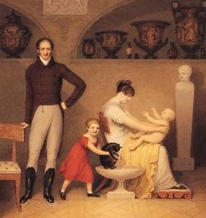 Two … Irish artists brothers of the name of Buck deserve attention. Their pencil groups, slightly coloured, were very popular ,and especially those in which the sitters were grouped in classic attitudes resembling those on Greek vases. The reason for the existence of these portraits was the love that Adam Buck especially had for Greek art. He issued a book on the paintings on Greek vases ,and he modelled many of his best miniatures, as well as his pencil groups, on the classic scenes so dear to him. His work, as a rule, can be distinguished by the exquisite drawing of the profile. His brother, Frederick, who commenced in his profession by painting portraits in crayon, also painted miniatures following on the lines of Adam Buck. Neither of the men were very good col ourists but both were accurate draughtsmen.” – How to Identify Portrait Miniatures, George Charles Williamson, Alyn Williams