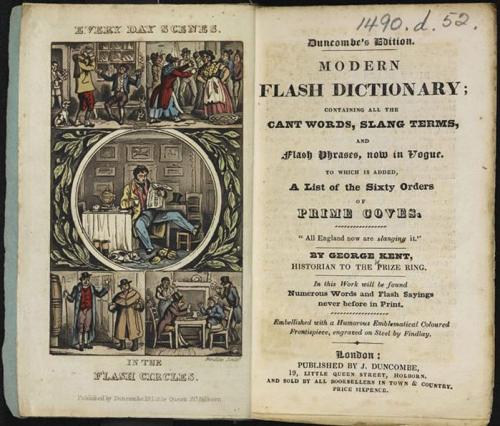 This cheap pamphlet was aimed at young working men interested in sport, gambling and drinking. It amied to cover criminal cant, sporting slan and ‘flash phrased now in vogue’. In the19th century, the word flash had several meanings. A fashionable man-about-town was commonly referred to as a flash cove and the meaning survives today in the phrase ‘flash Harry’. The dictuionary includes figures we would recognise, including fencers and shoplifters and unfamiliar terms, such as ‘priggers’ (pickpockets and ‘spicers’ (highwaymen). – George Kent, Modern Flash Dictionary. London, 1835.