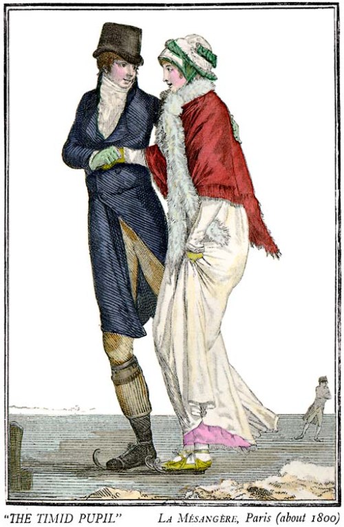 The Timid Pupil, 1800. Both this ladies feet are placed together, as her escort gently leads her over the ice.
