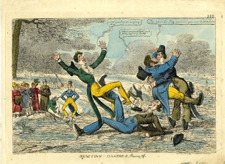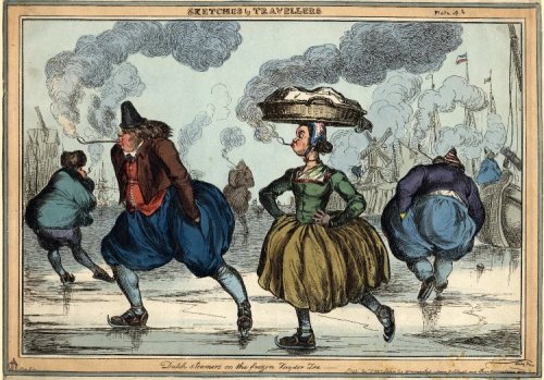 The humor of this illustration is that the Dutch couple are smoking – in fact, all the skaters are smoking in this caricature! I have always imagined that she is carrying their meal (or something to sell) on her head, for back in that little ice age the Dutch could travel great distances over frozen canals, from one town to the other. Imagine if she tripped, though!