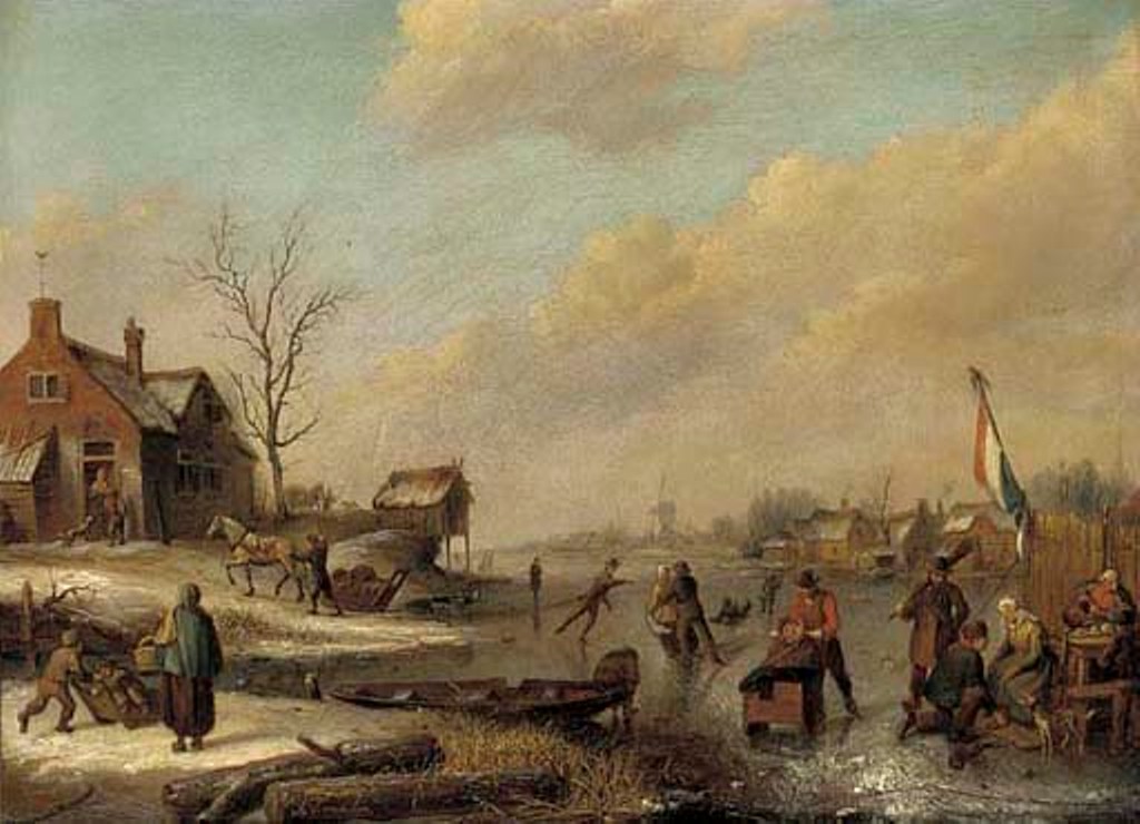 Frozen river in The Netherlands with townsfolk skating and sledging using various forms of sleds pushed by people, and one pulled by a horse. By Vermeulen
