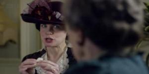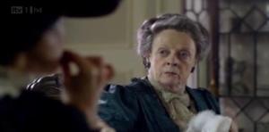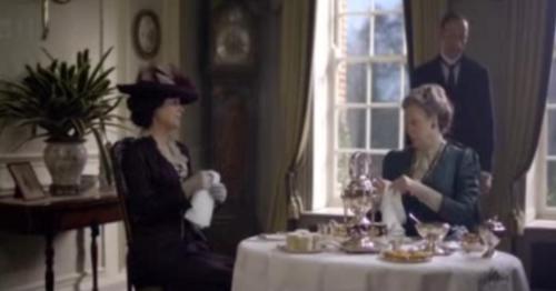 1. The caption to your second image, “The duchess pours boiling water over the tea leaves in the tea pot,” is not quite correct. At that exact moment in the scene, the Dowager Countess was pouring a bit of hot water into the empty tea pot in order to warm and clean it. We can be sure of this because her daughter-in-law still has both of her gloves on. By the time the Dowager Countess is actually pouring hot water onto tea leaves in the tea pot, her daughter-in-law has mostly removed her gloves (the show actually has a slight editing error here, showing more glove on that it should have).