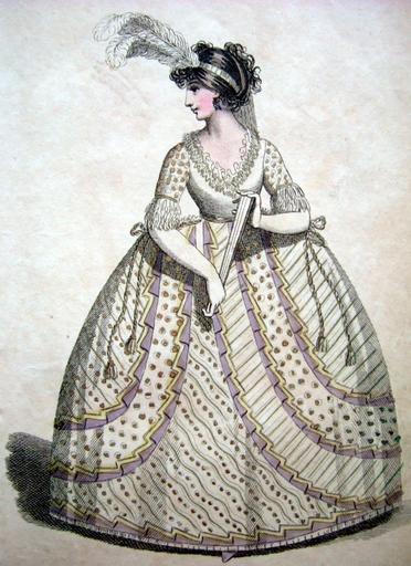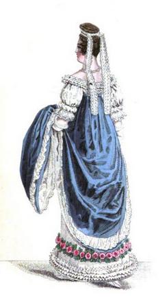 Bandeau with long lace streamers. 1818 French court dress, La Belle Assemblee.