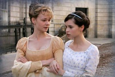 Felicity as Catherine Morland (2007) wears a thin bandeau. This image is inaccurate in that ladies in those days did not venture outdoors without a head cover. We can tell that Isabella (Carey Mulligan) is “fast” for she reveals more of her bosom during the day than is ladylike and wears no hat while strolling through Bath.