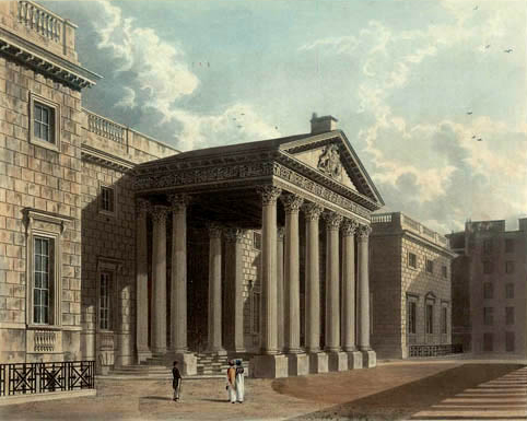 As to the remains of Carlton House, as Mr. Baty noted in his article, the columns of the portico were donated to the National Gallery, and to this day mark the front entrance of the building on Trafalgar Square. Most of the Prince’s fine collection of art was moved to the new Buckingham Palace, along with much of his finer furniture. That which was not wanted at Buckingham Palace seems to have made its way to other royal residences. A number of the doors, as Mr. Baty also noted, were used at Windsor Castle, which George IV was also “improving” at that time.