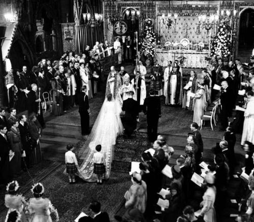 Full British pomp and formality is on display in this 1947 newsreel of Princess Elizabeth and Philip Mounbattan getting married at Westminster Abbey. The royal coaches and state landaus are in use, and in the Abbey, the women are wearing evening gowns. The Princess’s gown is by Norman Hartnell. In this video, the commentator describes eloquently the euphoria everyone feels watching the royal wedding, and the same is true for all royal weddings. He says, “For the people who had come from afar, the wedding was a family wedding for the entire British people. Everyone gladly shared in the rejoicings because the Crown once again was serving to remind us of the common humanity that unites us all.” The wedded union of royals represents hierogamy.