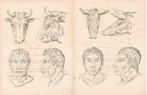 While Cruikshank’s images represented a fascinating study that provided a handy visual bank of expressions and features for the caricaturist, the study of physiognomy could take people down a dangerous path of fostering stereotypes. Hitler took to this practice to an extreme when he offered descriptions of ideal Aryan features and contrasted them to the facial features of the “typical Jew”. LeBrun’s image (above) compared people’s facial features to animals. There was nothing fun or funny about such sketches, which were more about prejudiced viewpoints than a reflection of reality.