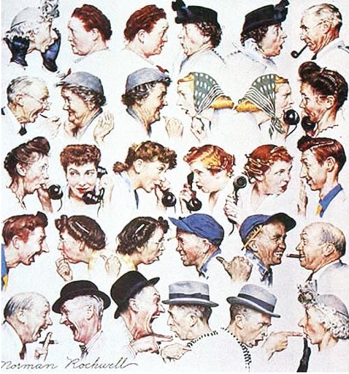 While it is hard for humans to escape first impressions and to be judged by looks alone, one has to tread carefully in making assumptions based on regular or irregular features. In the hands of a talented artist, however, one can tell much about the sitter’s character through the skilled manipulation of features and expression. Norman Rockwell tells a delightful tale about the nature of gossip in this masterful 20th century caricature. He needed no words to tell his humorous story.