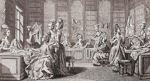 Early milliner shops were like our department stores, selling all manner of fashionable items. The image of a milliner shop in Paris shows the costumes we have come to associate with the era of Marie Antoinette. After the French Revolution, fashions changes drastically, for the French citizenry did not want to be reminded of the recent bloodshed or the ancient Regime. The rage in fashion was an imitation of the classical dress worn by the Greeks and Romans.