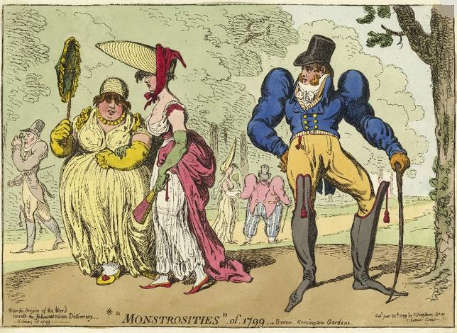 In some instances, nothing was left to the imagination. In the satirical image below by Isaac Cruikshank, the ladies are shown wearing next to nothing. Satire took many forms in the late 18th century. The Lady’s Monthly Museum featured a dialogue between a lady visiting Paris and a man milliner. His answer is hilarious.