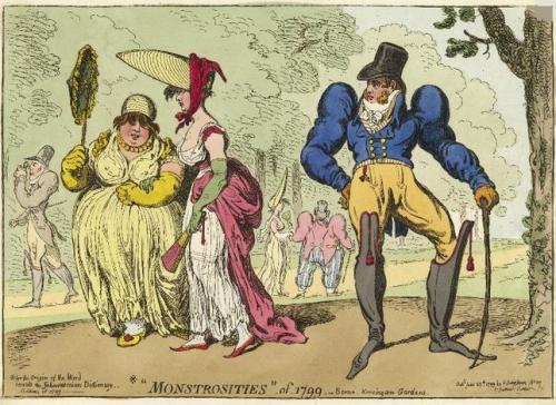 Parisians dressed in the new fashions were known as the “incroyables” (men) and the “merveilleuses,” (women.) These fashions were not at first admired and generally regarded as hideous. Caricaturists had a heyday making fun of these freaks of Fashion. British fashionistas shortly followed suit, as the cartoon by Gillray attests.