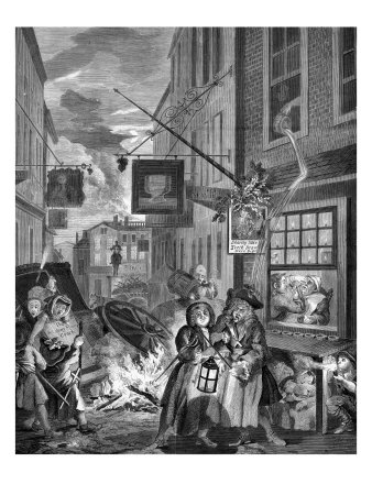 This is a raucous street scene in London at night in which the shop signs hanging over the pedestrians seem almost ominous. (Notice the slop being poured out of the window!)