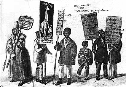 Bill stickers, or external paper hangers plastered blank walls, empty shops and wooden hoards and fences with advertisement bills. But these activities were taxed. And thus enterprising merchants turned to mobile advertising and paid people to wear sandwich boards and hand carry placards. – London Street Advertising