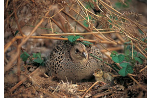 Although there is usually some attempt at concealment under covert, pheasants nests are not unfrequently placed even by perfectly wild birds in very exposed situations. Mr John Walton of Sholton Hall, Durham, related the following account of the singular tameness of a wild bred bird: A hen pheasant, a perfectly wild one so far as rearing is concerned, for we have no artificial processes here, selected as the site for her nest a hedge by a private cart road, where she was exposed to the constant traffic of carts farm servants and others passing and repassing her quarters, all of which she took with infinite composure. She was very soon discovered on her nest, and actually suffered herself when sitting to be stroked down her plumage by the children and others who visited her, and this without budging an inch. In fact, she seemed rather to like it. Perhaps she became a pet with the neighbours from this unusual docility, and her brood, fourteen in number, was thereby saved, for every egg was hatched, and the young birds have all got safely away. – Pheasants: Their Natural History and Practical Management