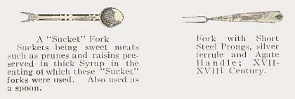 Slowly but surely the fork began to make inroads upon the dining table. As is the usual case, the wealthy began to adopt the new implement first. The upper crust began to impress their guests with forks made of expensive materials. Called suckett forks, they were used to protect the hands from sticky and messy foods or foods that stained the hands, like mulberries. By the mid 1600s, forks had become luxury items and were considered to be marks of fashion. At the end of the 17th century and beginning of the 18th century the three-tined fork was introduced. The “sherbet course”, introduced in the early 1700’s, was created to wash the single fork for the next course.” (The History of the Fork)
