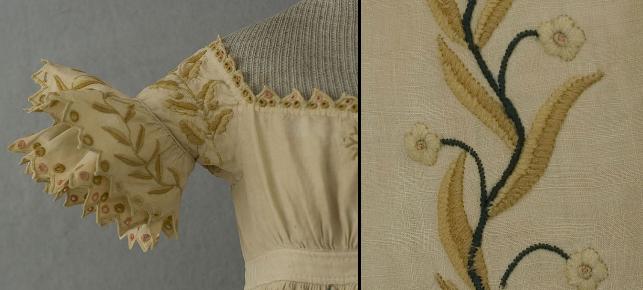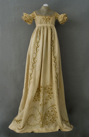 I love visiting Vintage Textile, one of the best, most descriptive vintage fashion sites on the Internet. The Regency era fashions are superb. Take this embroidered child’s dress, which was once white. It was made for a child around one or two years of age. The dress, which came from a New England estate, is long, like a christening dress, which suggests that the child would have been carried in it. The fabric is made of a lightweight cotton broadcloth, and the Persian-style Tree of Life embroidery design is made with wool floss. For more images and information about the dress or to purchase it, click here.