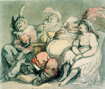 What is happening in this picture is a scene of debauchery. Tom is sitting to the right, his clothing loosened and being administered to by two prostitutes. A girl is removing her stockings in the foreground. Eventually she will be naked. A male servant is bringing in a silver platter for her to dance on. The tradition for new members of the trade, presumably still virgins, was to strip naked and perform a lewd dance on a silver plate high on a table for the wealthy clientele to view. She and her virginity would go to the highest bidder. A virgin could bring a very high price.