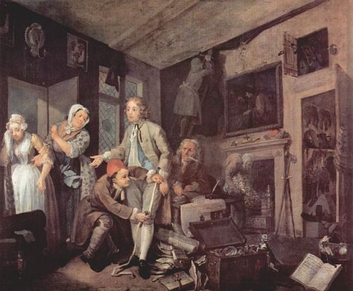 A rake was a stylised type of young man that had a literary tradition already before Hogarth began his series. He was generally regarded as a very impressionable young man, usually born and bred in the countryside to a wealthy father who had gained his riches by working hard and amassing a fortune which he had inevitably hoarded and not spent. The young man, cut off from society in the countryside during his childhood and not needing to work because of his inherited wealth, embarks on a dissolute life in the fleshpots of London. His fate usually includes the squandering of his fortune, venereal disease, prison and eventual death. Hogarth keeps to this format but also adds in a few other nuisances.