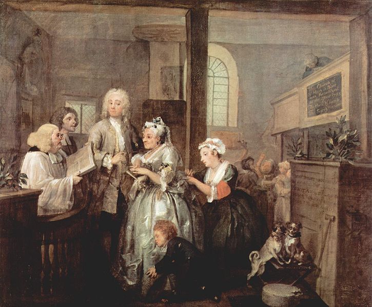 This is the interior of Marylebone Old Church. It was outside the city, towards Hyde Park. In the 18th century it became notorious for clandestine weddings. In this picture Hogarth shows Tom marrying an aging, overweight, one-eyed heiress undoubtedly for her money. He had to go to drastic lengths to pay his debtors and obtain more wealth. She may have lost her eye because of syphilis. Tom looks down on her as though she is a necessary evil, a bad smell under his nose that he must endure. She, undoubtedly, is looking forward to the wedding night. Two dogs show more love and affection than Tom shows for his bride. In the background a churchwarden refuses entry to Sarah Young and the child Tom has fathered with her.