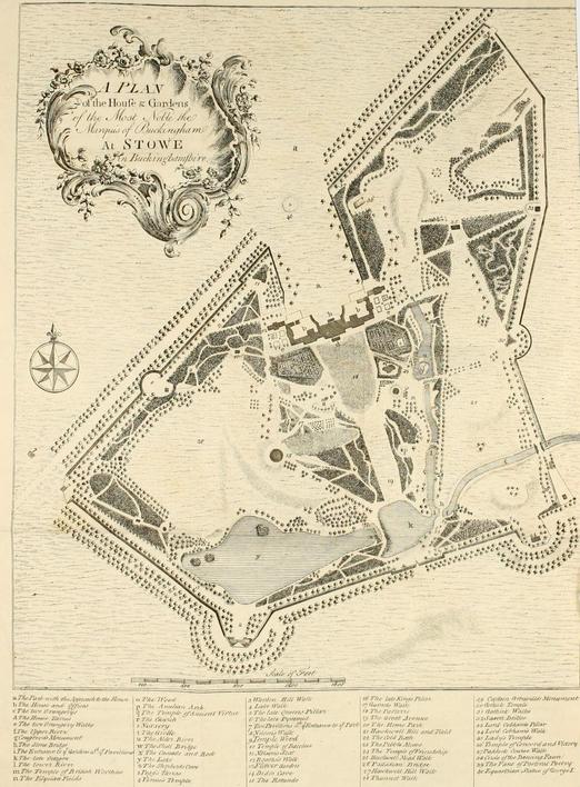 Benton Seeley’s guidebook, Stowe: A Description of the Magnificent House and Gardens of The Right Honourable Richard Grenville Temple, Earl Temple… Embellished with a General Plan of the Gardens, and also a separate Plan of each Building, with Perspective Views of the same, was published in the same year that Elizabeth Montague described Stowe’s gardens as “beyond description, it gives the best idea of Paradise that can be.” Visitors came away from viewing Stowe’s natural gardens inspired to implement changes to their own grounds. Seeley’s guidebook helped to spread Stowe’s influence throughout the 18th century as the model for the ideal English garden. (Today the original guidebook sells for close to $2,000.)