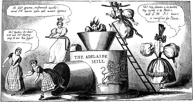 From other contemporary pictorial skits by Seymour we learn that various changes were made in the royal establishment, and the new queen seems to have addressed herself specially to a reform in the dresses of the court domestics. On the 1st of October, 1830, Seymour represents her grinding an enormous machine, called the “Adelaide Mill,” into which the women servants, dressed in the outrageous head-gear and leg-of-mutton sleeves of the period, are perforce ascending, and issuing from the other side attired in plain and more suitable apparel. “No silk gowns,” says Her Majesty as she turns the handle. “No French curls; and I’ll have you all wear aprons.” The new queen seems also to have shown a disposition to encourage native manufactures and produce at the expense of French and continental importations. These changes were not particularly pleasing to the Conservative lady patronesses of Almack’s, who were celebrated at this time for their capricious exclusiveness. One of Robert Seymour’s satires, bearing date the 1st of November, 1830, shows us a conference of these haughty dames, who seriously discuss the propriety of admitting some lady (probably the queen) who proposed appearing at one of the balls “in some vulgar stuff made by the canaille at a place called Kittlefields” [Spitalfields].” – English Caricaturists and Graphic Humourists of the Nineteenth Century. How they Illustrated and Interpreted their Times, by Graham Everitt