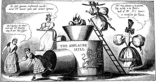 William was crowned King in 1830. By all accounts he was faithful to his queen. They lived a sober, almost boring life, but, sadly, their two infant children did not survive. Queen Adelaide’s strong influence throughout her marriage can be seen in this illustration.This cartoon of the Adelaide Mill, drawn by English caricaturist, Robert Seymour, shows Adelaide decreeing that the court domestics must dress more humbly: