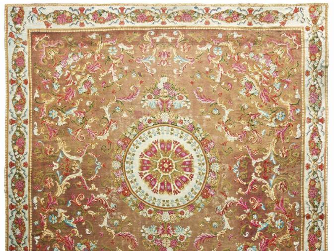 The early 19th century English Axminster carpet in the video above has a sand field with a golden leaf roundel containing four fish around a naturalistic lion head within a border of finely-drawn mythological animals, palmettes and vinery. It goes for $425,000