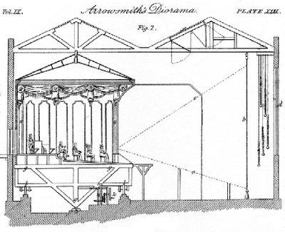 The visitors, after passing through a gloomy anteroom, were ushered into a circular chamber, apparently quite dark. One or two small shrouded lamps placed on the floor served dimly to light the way to a few descending steps and the voice of an invisible guide gave directions to walk forward. The eye soon became sufficiently accustomed to the darkness to distinguish the objects around and to perceive that there were several persons seated on benches opposite an open space resembling a large window. Through the window was seen the interior of Canterbury Cathedral undergoing partial repair with the figures of two or three workmen resting from their labours. The pillars, the arches, the stone floor and steps, stained with damp, and the planks of wood strewn on the ground, all seemed to stand out in bold relief, so solidly as not to admit a doubt of their substantiality, whilst the floor extended to the distant pillars, temptingly inviting the tread of exploring footsteps. Few could be persuaded that what they saw was a mere painting on a flat surface. The impression was strengthened by perceiving the light and shadows change, as if clouds were passing over the sun, the rays of which occasionally shone through the painted windows, casting coloured shadows on the floor. Then shortly the lightness would disappear and the former gloom again obscure the objects that had been momentarily illumined. The illusion was rendered more perfect by the sensitive condition of the eye in the darkness of the surrounding chamber.” “- The History of the Discovery of Cinematography http://www.precinemahistory.net/1800.htm