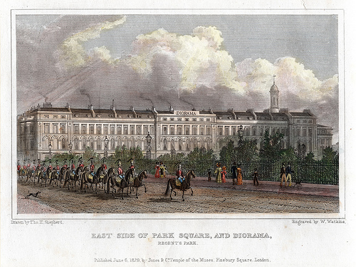 One year after Daguerre’s introduction of this wondrous new entertainment, the first diorama opened up in London in Regent’s Park. (The building still stands, but the interior has been vastly transformed.) The subject matter included landscape scenes of the grand tour, religious stories, recreations of paintings and grand architecture, and historical themes well-known to the public. The images could be made more or less bright according to the mood or atmosphere required by the theme. Props were also added for realism:
