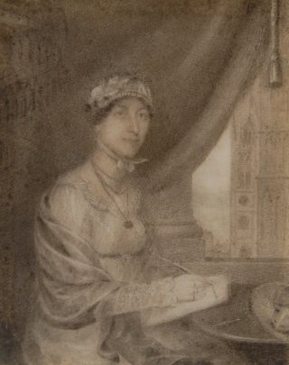 Jane Austen dedicated Emma to the Prince Regent, though it is assumed that this was at the suggestion of her publisher. That she saw herself as an ‘arrived’ author, knowing her literary worth, even though she remained nameless on her title pages, suggests she might have consented to be portrayed as a woman of letters. The high finish of the drawing did not require her presence once she had sat for the face and pose, any more than she herself needed to sit in front of a column, drape and Westminster Abbey. It might be that the portrait was for someone else, and therefore was not sent off to Chawton, or for any one or several of any number of reasons it was not dispatched to the sitter. That the Austen family was unaware of its existance does not tell against it. Maybe she sat for her portrait and did not like it, perhaps because it emphasized the size of the nose, a feature about which she was sensitive, a sensitivity respected by Cassandra’s diminuation of it and the posthumous tact of the biography.