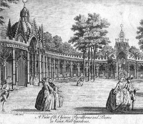 A statue of the composer Handel could be seen in front of this. The gardens were famous at this time for giving performances of new pieces composed by Handel or other composers well known at the time, such as Arne and Boyce.