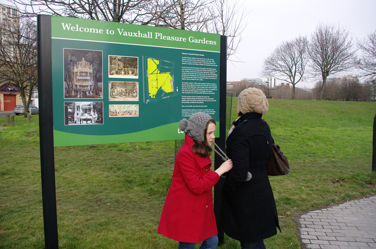Behind the pub is a small park called Spring Park. This area was covered in Victorian terraced housing up to the second World War and then during the Blitz on London many were destroyed. After the war, to commemorate the old pleasure gardens, Lambeth Council decided to make the area into a park again. This was the site of the original pleasure gardens. We had found it. To one side you can see the green glass and concrete structure that is MI6.The entrance to the park announces that this is Vauxhall Pleasure Gardens, although it is officially called Spring Gardens. When I researched the old gardens I discovered that indeed it used to called Vauxhall Spring Gardens when it first began. There is a large sign board as you walk into Spring Gardens which provides a display of old pictures of the gardens and a history of the site.
