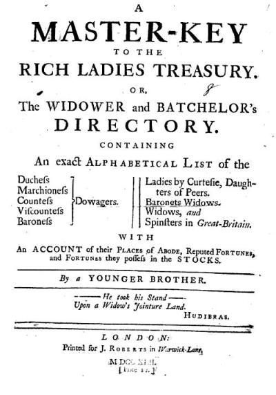 - A Master-Key to the Rich Ladies Treasury or The Widower and Batchelor’s Directory by a Younger Brother, published in 1742.