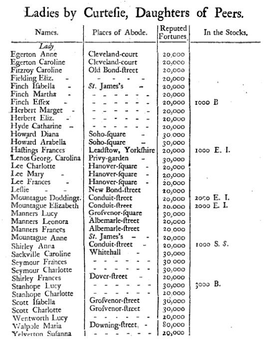This book was compiled for those men who were unlucky to follow in their elder brothers’ shadows, for the laws of primogeniture dictated that the eldest son would inherit everything. The ladies are described in its pages with their names, where they live, the largeness of their reputed fortunes and of the stocks held in their names.