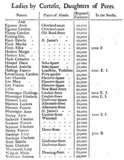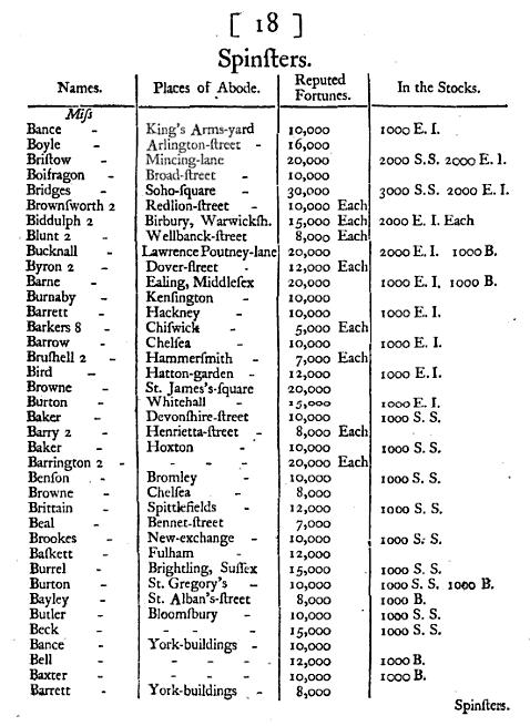 Whoever has read the Advertisements in the public Papers of Mr. C—-x, and the unknown Lady who accepted of his Proposals, will instantly acknowledge the Usefulness of the following Directory: The Dilemma that Gentleman was reduced for a Partner, determined the Compiler to set about it: He resolved to spare no Pains: He carefully examined every List of the Proprietors of the public Funds; and made afterwards the best Enquiry he was capable of, into their Fortunes exclusive: As it was impossible to give the exact Fortune of every lady in so large a List as the following, he thought proper to make in his Kalender, one Column under the Title of Reputed Fortunes.”