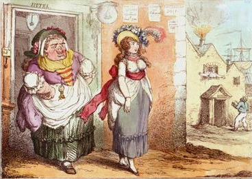 Economics was the driving engine of the thriving whore business in London. One in five women made a living as a prostitute, a remarkable number. The young women and girls who chose prostitution as a living were undereducated and fit only to work in backbreaking, menial jobs. Most prostitutes were independent street-walkers and kept a majority of their wages. A London prostitute stood an excellent chance of earning more than £400 a year. Contrast this income to a housemaid’s earnings of £5 a year, and one can readily see why so many women were drawn to the trade. Forty per cent of prostitutes came from London, while 60% came from the countryside and Ireland. Pimps, bawds, and procuresses (aging former prostitutes) exploited young girls arriving from the country (shades of Fanny Hill). They could make a tidy sum of money, for the deflowering rights of a young virgin went for £150, or £11,000 in today’s sums. (Sin City: One in Five Women in 1700’s London Were Prostitutes.)